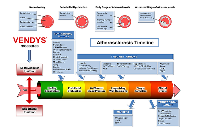 Atherosclerosis (plague build up) and risk factors impair the ability of the endothelium to secrete nitric oxide. Reduced availability of nitric oxide causes the blood vessels to become slow to dilate and slow to increase blood flow, even become constricted instead. This response can be measured. A healthy endothelium is the first defense against plaque build-up.