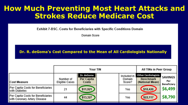 With improved patient outcomes, there is a very significant savings for Medicare. Compared to national average for cardiologists, Dr. deGoma save Medicare $8,790 per beneficiary with diagnosis of coronary artery disease and $6,499 per beneficiary with diagnosis of diabetes.